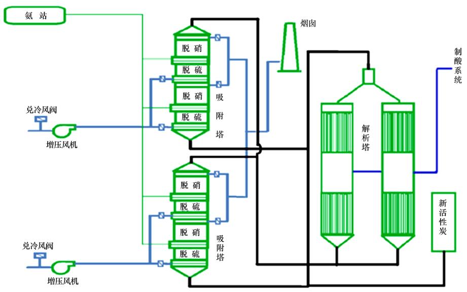 SO2通過活性炭的吸附、解析作用,再經過觸媒的催化氧化制成濃硫酸,實現(xiàn)了資源回收利用。通過脫硫段后,在上升的煙氣中進行噴氨,進入脫硝段后在活性炭的催化作用下NOx轉化為氮氣和水進行脫硝。