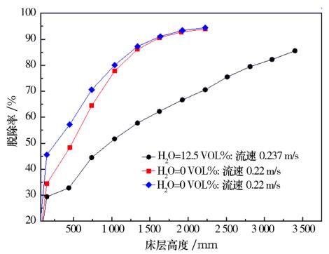 為了實現(xiàn)在最經濟的條件下去除高達99%的SO2和其他有害物質,并通過選擇性催化還原反應去除85%的NOx,通過先導試驗確定床層高度。活性炭床層高度對NOx脫除率以及脫除率增加量的影響分別如圖4(圖中H2O含量為其體積分數(shù))和圖5所示。