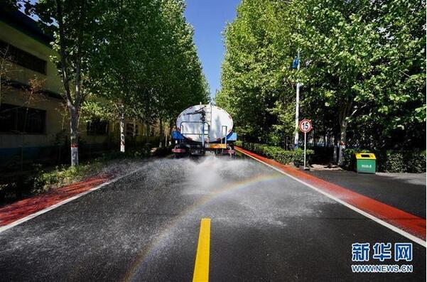 4月23日,灑水車在位于河北省沙河市的河北鑫利玻璃有限公司廠區內灑水防塵。 2019年起,有“中國玻璃城”美譽的河北沙河市啟動了“煙羽消白”工程,先后投入20億元對在產玻璃生產線實施超低排放改造,并結合提升廠區環境、優化產能等措施,削減粉塵、二氧化硫、氮氧化物等污染物排放,推進大氣污染治理。新華社記者 牟宇 攝
