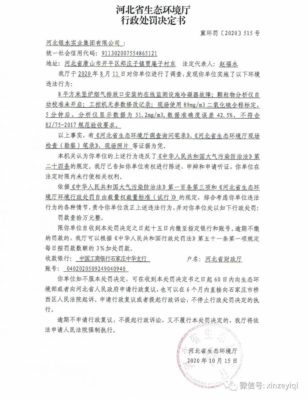 近日,河北省生態環境廳公開了2020年執法檢查中發現的幾起關于在線監測行政處罰決定書,從處罰決定書中看出多數是由于CEMS校準或通標氣測試不滿足技術指標要求,其中二氧化硫全程通標氣測試不滿足要求的情況尤為突出,以下是河北省生態環境廳對相關企業的行政處罰決定書。