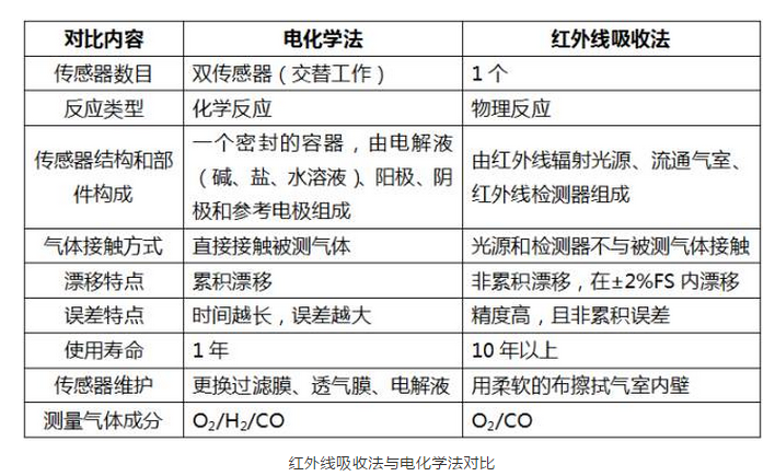 CO氣體檢測的主要方法有:紅外線吸收法、電化學(xué)法、電氣法(熱導(dǎo)式和半導(dǎo)式)、色譜法,目前CO氣體濃度在線檢測通常使用紅外線吸收法、電化學(xué)法。