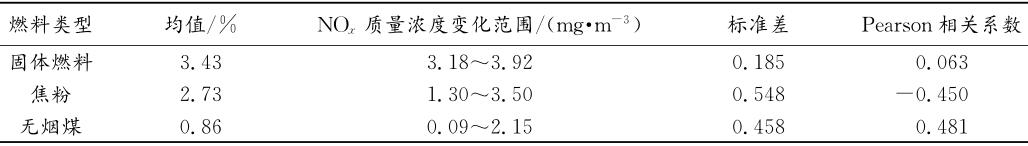 因此,在探討固體燃料類型對(duì)NOx排放的影響規(guī)律時(shí),將固體燃料比例固定,研究焦粉和無(wú)煙煤的比例變化對(duì)煙氣NOx排放的影響規(guī)律。根據(jù)固體燃料比例樣本數(shù)據(jù)的分布規(guī)律,選取具有代表性的固體燃料比例為3.3%~3.5%的樣本數(shù)據(jù)進(jìn)行相關(guān)性分析研究,結(jié)果見(jiàn)表3。