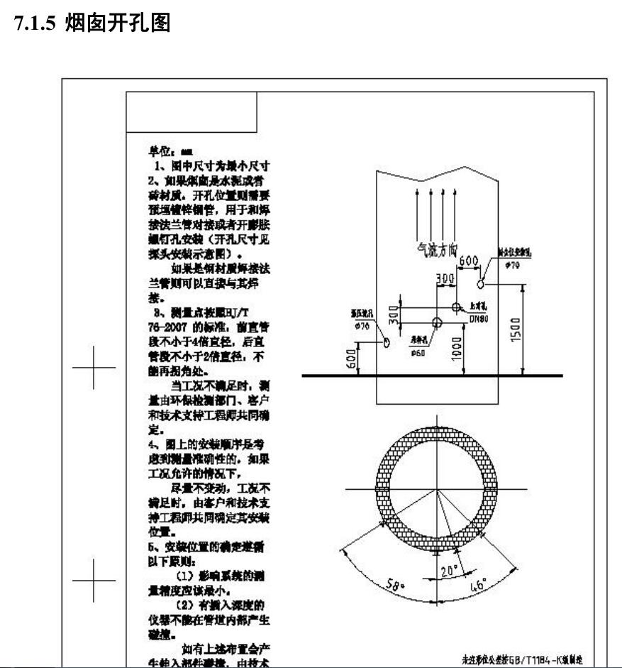 安裝煙氣在線監測設備的煙囪上,按照國家75/76標準的話,一般情況下要開4個或者5個孔;都有氣體污染物孔、溫壓流孔、粉塵(顆粒物)孔、環保局比對口;如果測濕度的話,那就加一個濕度孔。在開好孔之后,一定要根據煙囪的材質,安裝好相應的法蘭。