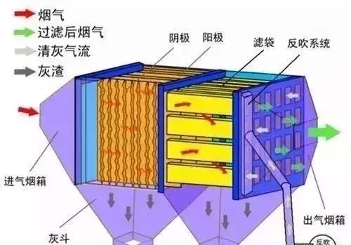 采用“前級電除塵器+后級袋式除塵器”的配置型式,首先由前電場捕集80%左右的粗粉塵,其余粉塵則由堆積在濾袋上的荷電粉餅層捕獲。
